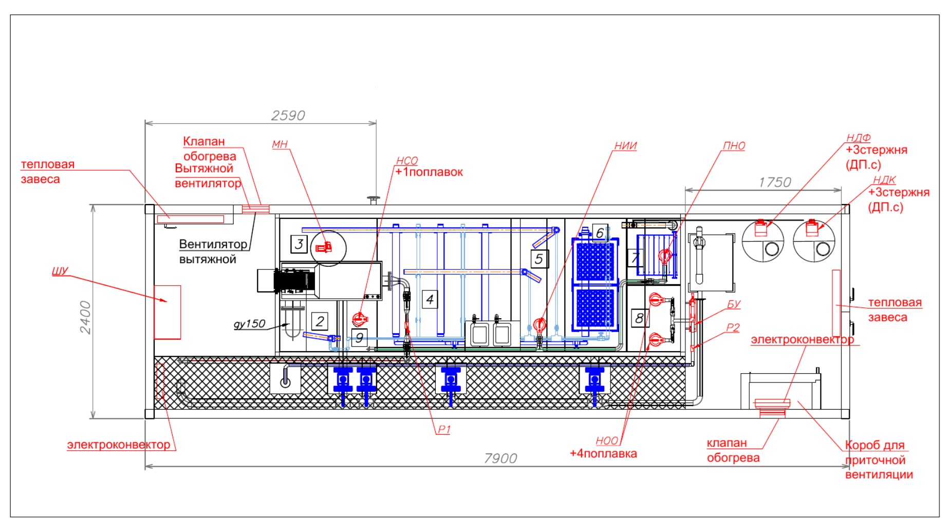 Работа установки полностью автоматизирована и не требует постоянного присутствия обслуживающего персонала. Внутри предусмотрено все для удобной эксплуатации: электроосвещение, система отопления и вентиляции.